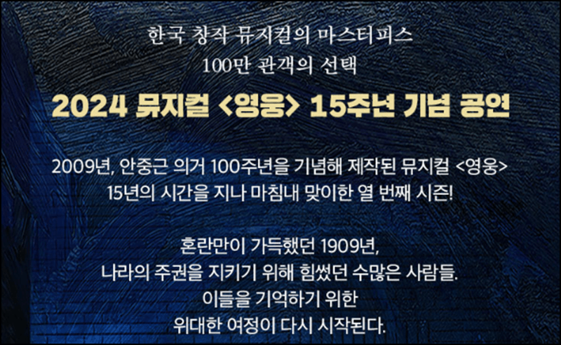 뮤지컬 영웅은 일제강점기 시대를 배경으로 한 역사적 인물 안중근 의사의 이야기를 담고 있습니다. 그의 삶과 업적, 조국을 위해 희생한 영웅적인 모습이 감동적으로 그려진 작품입니다. 뮤지컬 영웅의 따끈따끈한 후기! 지금 바로 확인해 보세요.